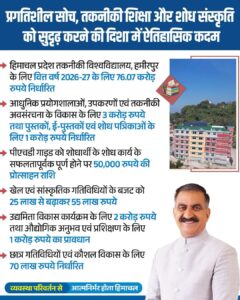 हिमाचल प्रदेश सरकार ने शिक्षा और तकनीकी विकास को नई दिशा देने की दिशा में एक महत्वपूर्ण कदम उठाते हुए हिमाचल प्रदेश तकनीकी विश्वविद्यालय, हमीरपुर के लिए वित्त वर्ष 2026-27 हेतु 76.07 करोड़ रुपये का बजट निर्धारित किया है। यह प्रावधान विश्वविद्यालय को आधुनिक सुविधाओं से सुसज्जित कर उसे अनुसंधान, नवाचार और गुणवत्तापूर्ण शिक्षा का प्रमुख केंद्र बनाने की दिशा में मील का पत्थर साबित होगा।