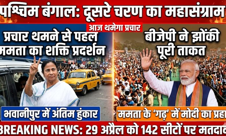कोलकाता: पश्चिम बंगाल विधानसभा चुनाव 2026 के दूसरे और अंतिम चरण के लिए आज शाम प्रचार का शोर पूरी तरह थम जाएगा। राज्य की कुल 294 सीटों में से शेष 142 विधानसभा क्षेत्रों में बुधवार, 29 अप्रैल को मतदान होना है। पहले चरण में हुई भारी वोटिंग (93%) के बाद अब सभी राजनीतिक दलों ने दूसरे चरण के लिए अपना पूरा जोर लगा दिया है।