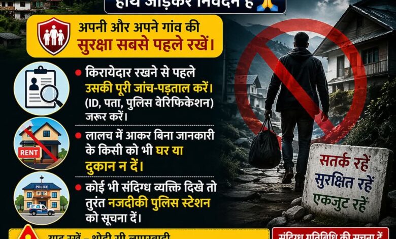 हिमाचल प्रदेश में बढ़ती सुरक्षा चुनौतियों के बीच प्रशासन और पुलिस विभाग ने प्रदेशवासियों से सतर्क रहने की अपील की है। जारी जन-जागरूकता संदेश में स्पष्ट किया गया है कि आम नागरिकों की थोड़ी सी लापरवाही पूरे गांव और परिवार को खतरे में डाल सकती है। ऐसे में हर व्यक्ति की जिम्मेदारी है कि वह अपनी और अपने आसपास के लोगों की सुरक्षा सुनिश्चित करे।